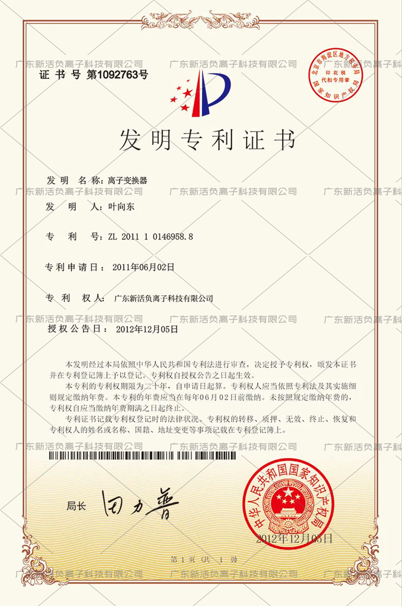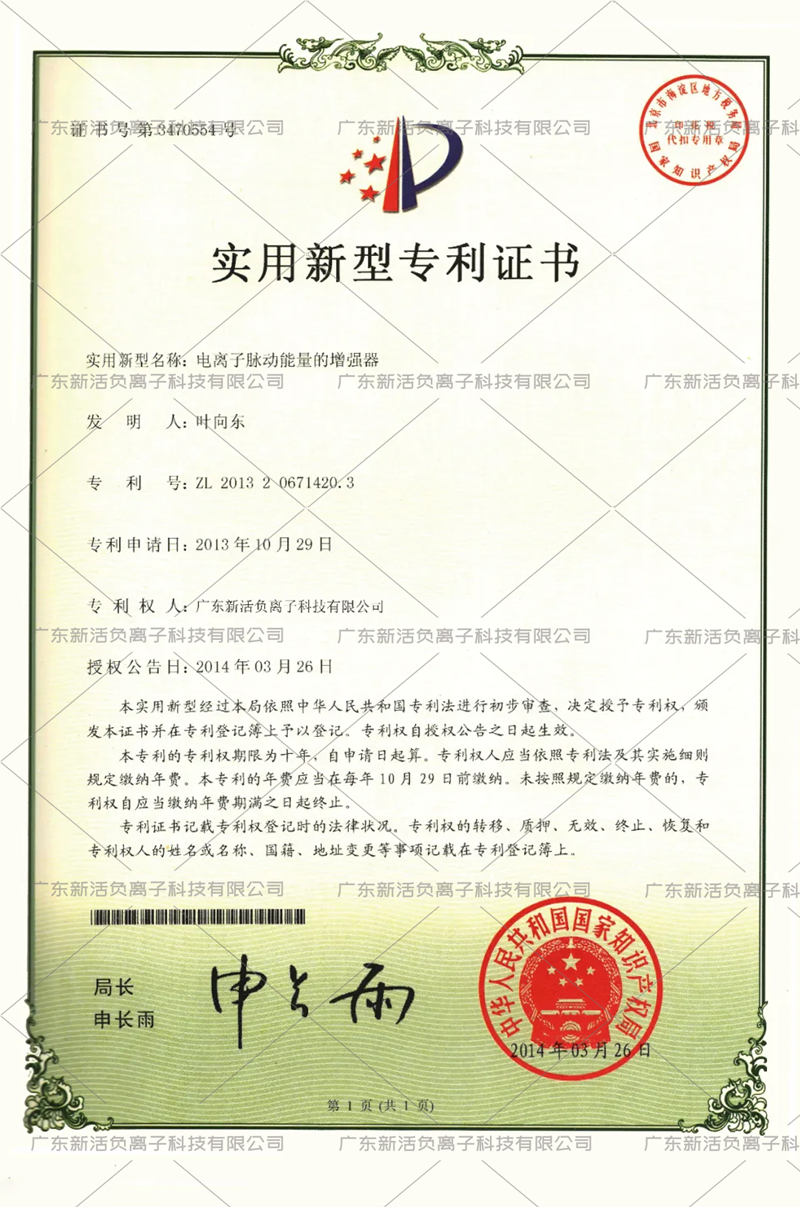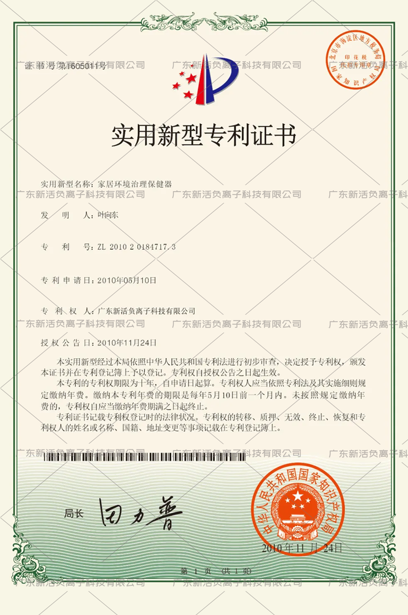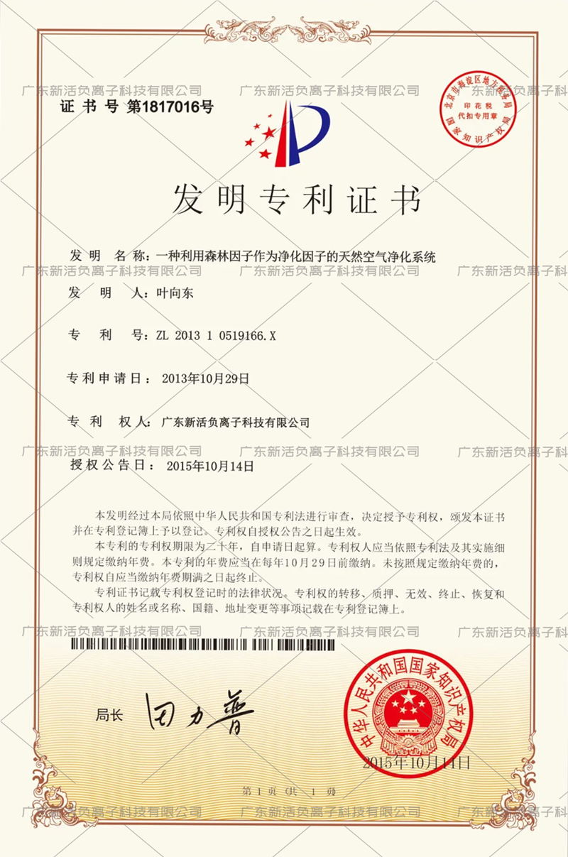 公司產品先后榮獲國家知識產權局專利授權100余項。旗下產品森肽基負氧離子生產機、森肽基空氣負離子空氣凈化器、班泰克斯負離子空氣處理器(中外合作項目)先后通過中國科學院、中國疾病預防控制中心……