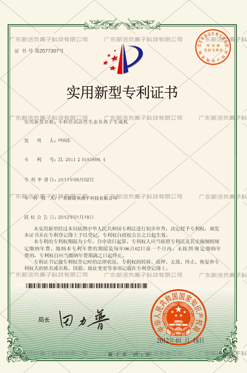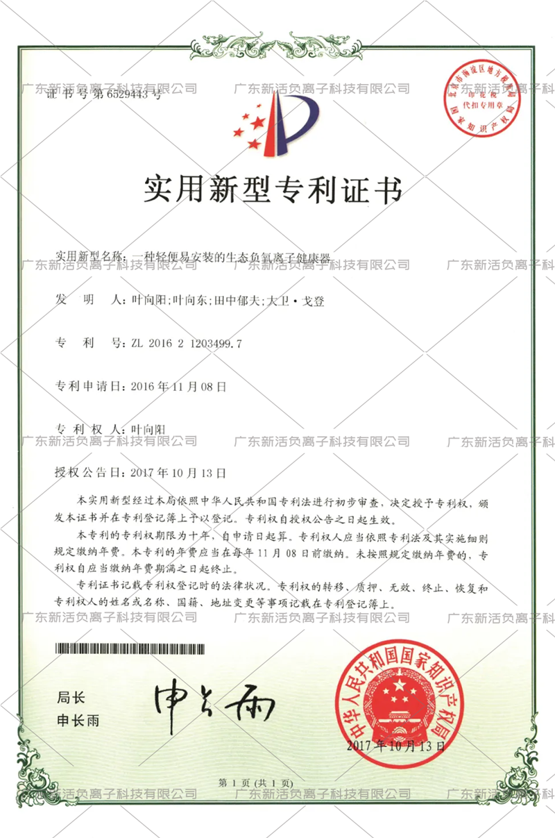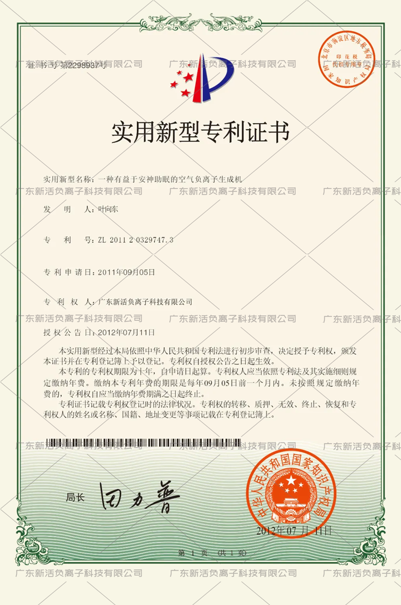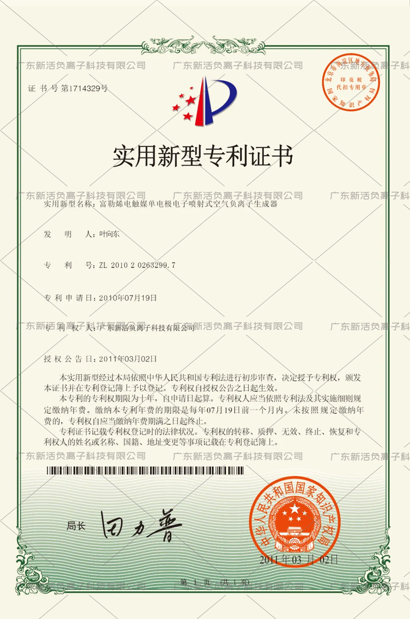 公司產品先后榮獲國家知識產權局專利授權100余項。旗下產品森肽基負氧離子生產機、森肽基空氣負離子空氣凈化器、班泰克斯負離子空氣處理器(中外合作項目)先后通過中國科學院、中國疾病預防控制中心……