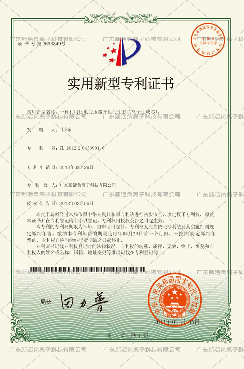 | ZL201220433901.6 | 一種利用壓電變壓器升壓的生態負離子生成芯片 |